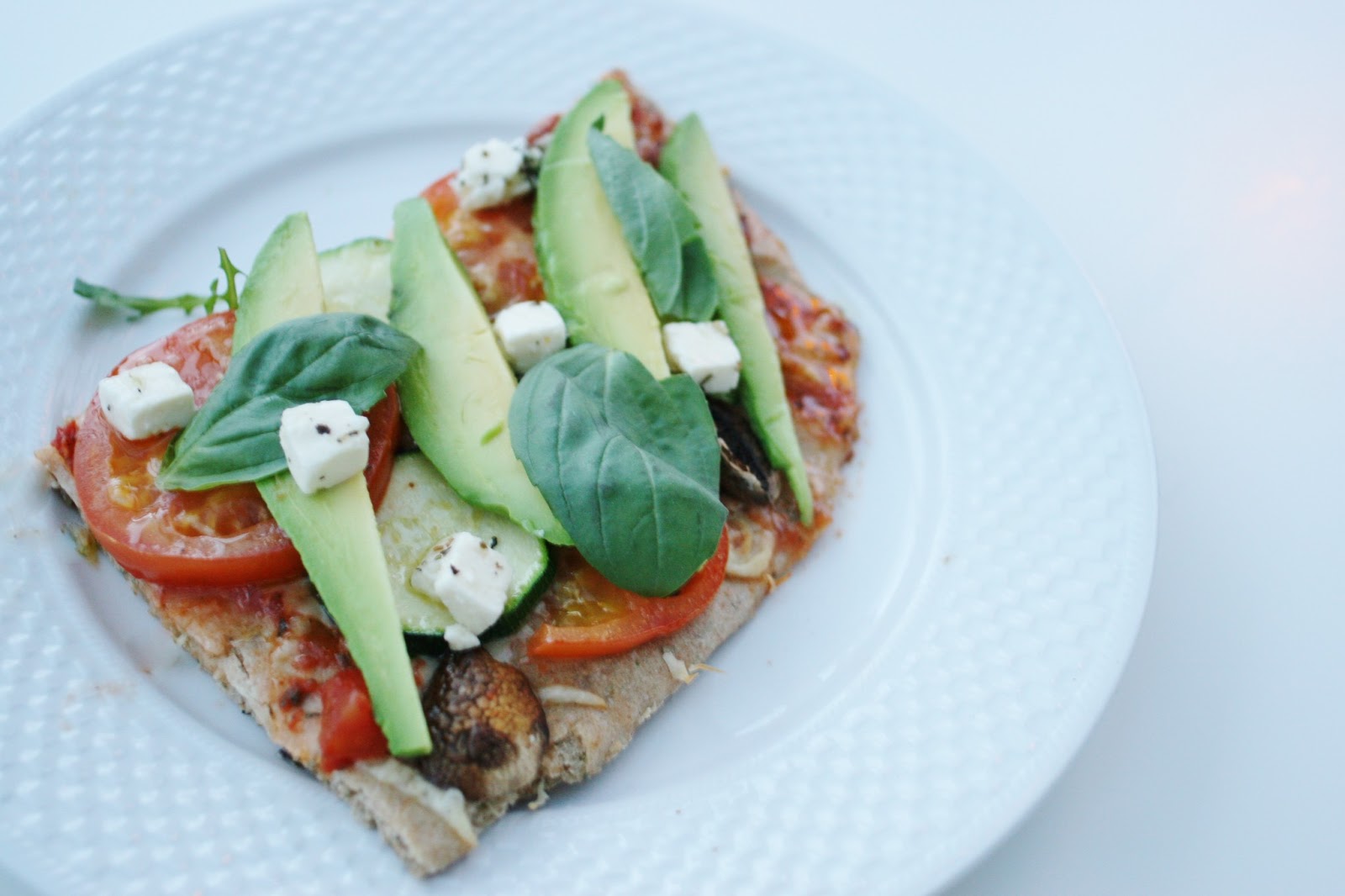 Ég skar niður það grænmeti sem ég vildi á mína pítsu, lét sósu á pítsabotninn og dreifði rifnum osti yfir. Raðaði síðan grænmetinu ofan á pítsuna og kryddaði til með salti og pipar. Ath. að ferska basilíkan, avókadó og fetaosturinn eiga ekki að fara á pítsuna fyrr en hún er tilbúin. Setjið pítsuna því næst inn í ofn við 150°C í 8 – 10 mínútur.
